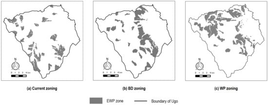 Sustainable forest management depends on the application of scientific zoning methods. We considered three forms of zoning: current zoning, zoning to enhance biodiversity (BD zoning), and zoning to enhance wood production (WP zoning) (Figure 6). In BD zoning, compartments with the lowest proportion of natural forest were assigned an EWP zone. In WP zoning, slope degree, stand index, and area of plantation Japanese cedar, which is the major forestry species in Japan were considered. Each district was given a score for the ratio of area of less than slope to the total area, the average stand index, and the ratio of ceder plantation area to the total area, with each parameter assigned a score of 1 to 5 for each conditions. As a final score for each district, individual parameter scores were summed. Then districts were converted from their current condition to EWP, starting with the stands that received the highest score. The total area of the EWP zone was adjusted to be about the same in each plan. Forest compartments were determined by the local government according to natural landscape features. The mean area is 66.4 ha.