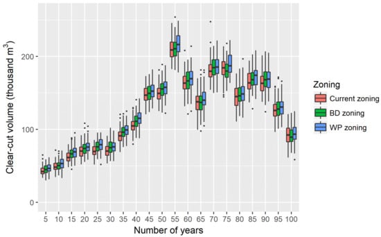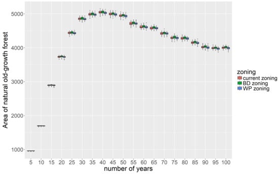 In general, the total area of natural old-growth forest increased for the first 40 years owing to the current age distribution then decreased slightly until around 90 years. Thereafter, there were only slight differences as clear-cutting balanced the growth of forest across the whole region (Figure 9). BD zoning maximized the total area; at 100 years, the area was 16 ha or 0.4% more than in current zoning and 33 ha or 0.8% more than in WP zoning. The smaller area in WP zoning could be explained by its greater clear-cut volume. These results indicate the possibility of enhancing biodiversity by zoning and trade-offs between wood production and biodiversity.