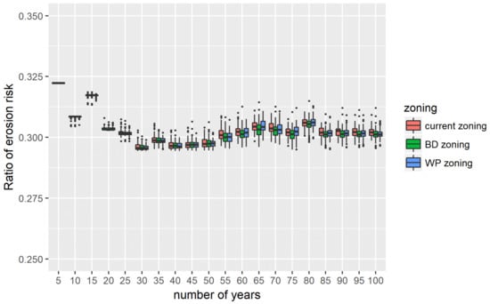 Change in area at >15% risk of soil erosion over 100 years simulated with the DSS. Boxes show median values, maximum and minimum values, and quartiles of each trial.