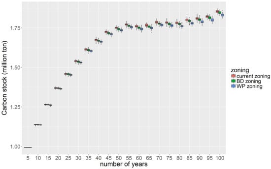 Current zoning maximized the total area; at 100 years, the area was 8000 ton or 0.4% more than in BD zoning and 23,000 or 1.2% more than in WP zoning. The carbon stock of living biomass was relatively high in current zoning. The relative low wood production in current zoning can cause this trend. These results indicate the possibility of trade-offs between wood production and carbon retention.