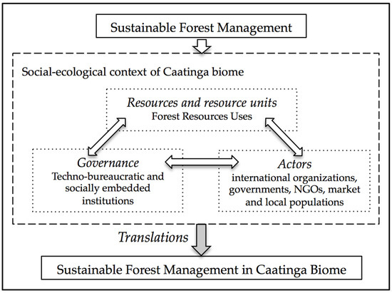 Sustainable Forest Management (SFM) has globally gained support as a strategy to use and manage forest resources while maintaining forest ecosystem services. However, type, relevance, and utilisation of forest ecosystem services vary across eco-regions, countries, and policy implementation pathways. As such, the concept of SFM is subject to a series of translations within the social-ecological context in which it is implemented. This article discusses translations of SFM in Caatinga biome—a tropical dry forest in the north-eastern semi-arid region of Brazil. Our analysis is based on a qualitative analysis of 24 semi-structured interviews and 30 documents. We discuss SFM and the interplay of resources, governance, and actors. Results for Caatinga show that (1) a technical approach to SFM that focuses on firewood and charcoal production is dominant; that (2) SFM implementation practices hardly address the needs and interests of local populations; and that (3) local actors show little support for the implementation of SFM. We conclude that the social-ecological context of Caatinga shapes translations of SFM mostly in a techno-bureaucratic rather than a socially embedded way. As a result, local practices of forest use are excluded from the regional SFM approach, which negatively affects its implementation.