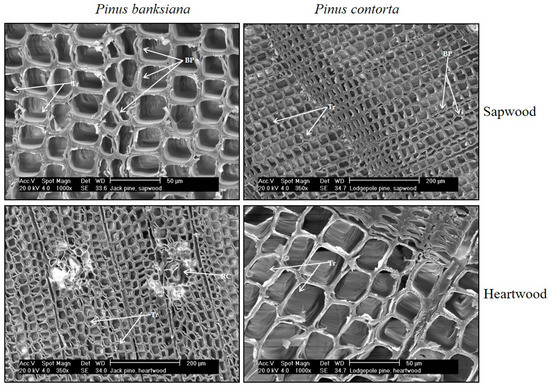 Scanning electron micrographs of Pinus banksiana and Pinus contorta stems tissues. Notice the clogged resin canals (RC) in the Pinus banksiana heartwood. The sapwood micrographs show the bordered pits (BP) between tracheids (Tr).