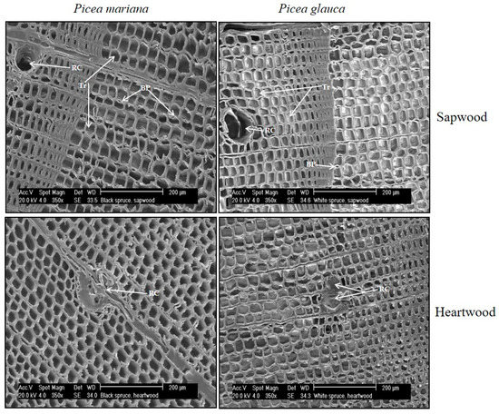 Scanning electron micrographs of Picea mariana and Picea glauca stems tissues. The sapwood micrographs for both species show open resin canals (RC) and bordered pits (BP) between tracheids (Tr). Notice that the resin canals are clogged in the heartwood tissues.