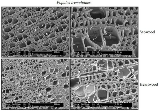 In the Populus tremuloides samples, the vessels are widely spread in the sapwood (diffuse-porous) and fibres between them sustain the entire sapwood structure. When the sapwood loses its sap-conducting capability, those vessels are sealed either with tyloses or gums, and the sapwood becomes heartwood (see the micrographs in Figure 3). Tyloses are the key feature for distinguishing between sapwood and heartwood. Populus tremuloides has tyloses in its sapwood as well; however, the increment of tyloses in its heartwood is considerably higher.