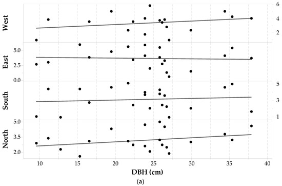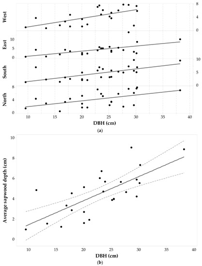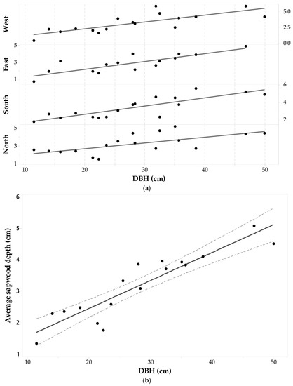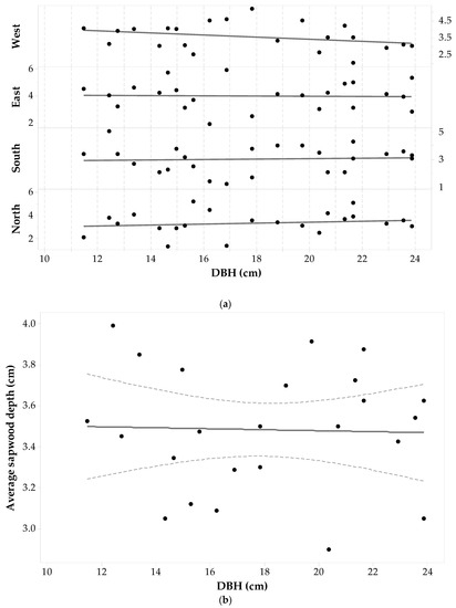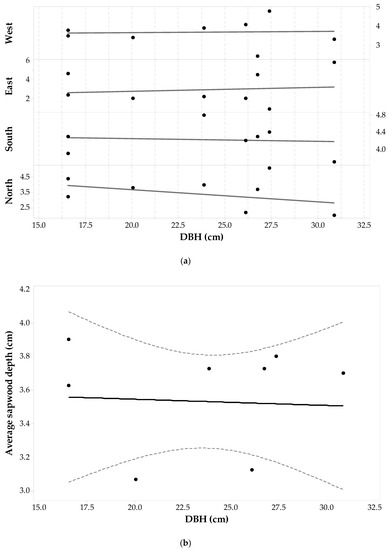 Individual sdcp values are plotted against DBH and shown in Figure 7a. Sixty seven percent of the Picea mariana sample set have the largest sapwood depths at the North and East sides (38% from the East side and 29% from the North side), while 52% have the shortest sapwood depths on the South and West sides (38% from the South and 14% from the West). Furthermore, there are trees having the largest sapwood depths on the South-West sides (33% with 4% from the South and 29% on the West) and the shortest on the North and East sides as well (48% with 24% on the East and 24% on the North). Thus, the North-East side dominates the largest sapwood depth values, and the South-West side develops the smallest sdcp. However, a one-way ANOVA with repeated measures shows that the effect of cardinal direction on sd values is not statistically significant (F3,63 = 0.906, p-value = 0.444, α = 0.05). Figure 7a does not appear to show a clear relationship between DBH and sapwood depth but ANOVA statistics report that there is a significant relationship with F18,61 = 4.01, p-value < 0.001, α = 0.05. Figure 7b is a plot of and DBH with the following fitted linear regression model—Equation (3):