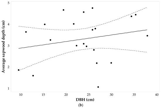 Figure 5b shows a fitted linear regression model between average sapwood depth and DBH. A regression analysis produced a model of the following form—Equation (2):