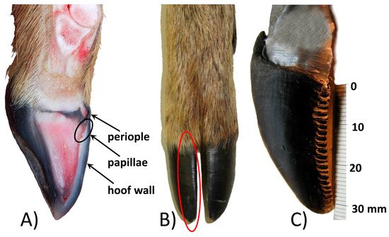 The European roe deer (Capreolus capreolus L.) is an even-toed ungulate whose weight is borne approximately equally by the third and fourth toes. It has a body length of 95–135 cm, a shoulder height of 65–75 cm, and a weight of 15–35 kg [18,19]. In the wild, roe deer attain a lifespan of 10 years [19]. Roe deer do not have horns but antlers that grow only during a short period of time and thus cannot provide a continuous nutrition record. Hairs are limited in suitability, too, because of the seasonal change between winter and summer fur, causing the hair growth rate to change seasonally. In contrast, hooves should grow more continuously because they are continuously worn down and they would allow retrieving isotope information over some months. The papillae (Figure 1A) are pushing the hoof wall downwards, therefore providing a chronological record of hoof growth from hoof entry to hoof tip. Due to the slanting arrangement of the papillae, deep-seated layers of the wall are slightly younger than superficial layers.