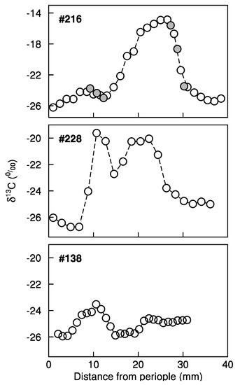 Longitudinal variation of δ13C along the anterior edge of the hoof sampled from animal #216, #228, and #138. Note that y scaling differs for #216. Grey filled circles show data from a second sampling.