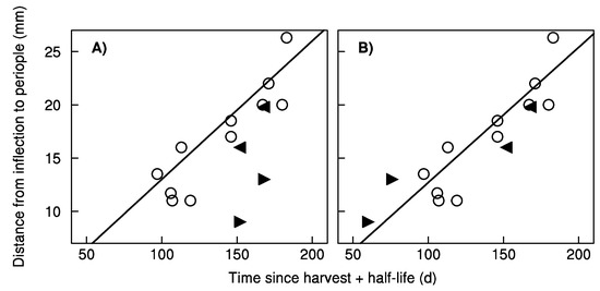 Distance between the inflection point and the periople depending on the time since the maize harvest plus one half-life at the date of hunting. In (A) only the animals with one clear peak (open circles) were used to calculate mean growth rate (0.130 mm/day; line); In (B) also the more distant peaks (left-tipped triangles) of the two animals with two peaks were used to calculate growth rate (0.122 mm/day). The peaks closer to the periople (right-tipped triangles) were assumed to result from winter feed provision. They are plotted at a position which would result if winter feed provision ended in early February, but were not included in the calculation of mean growth rate.