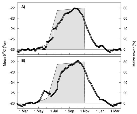 Daily mean δ13C in hoof keratin (circles) versus time averaged over 17 animals hunted between mid-February and mid-May. Mean SE for 17 animals is 0.44‰. Average development of maize cover (shaded area) within the research region was taken from [22]. In (A) time was derived from the distance to the periople, a relative growth rate of 0.365%/day and the date of hunting; a half-life of 12 day was subtracted. In (B) time was derived from the distance to the periople, an absolute growth rate of 0.122 mm/day and the date of hunting; a half-life of 12 day was subtracted.