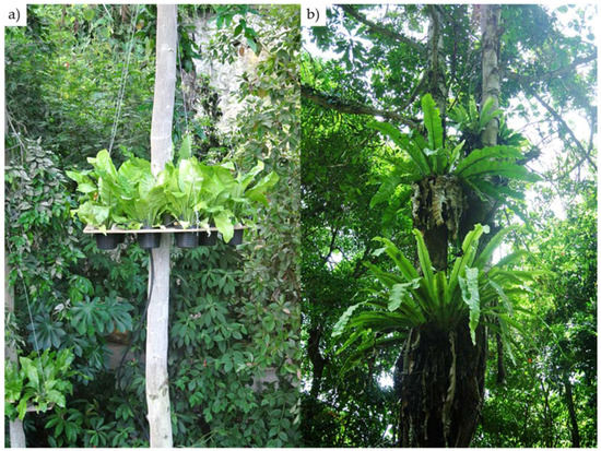 Ten ferns were suspended in two H. odorata trees using platforms installed 8 m from the ground to simulate epiphytic conditions. An irrigation system, incorporated into the design of the platforms [42], delivered 0.5 L of water daily over an interval of five minutes to each of the 20 suspended plants (Figure 1a). Perforated aquatic plant pots containing the ferns allowed for drainage and air drying of the soils over a period of 24 h, simulating the drying and rewetting cycles associated with rain forest canopy epiphytes [45].
