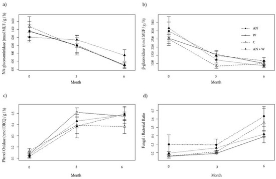 Fungal:bacterial ratios started to increase after 3 months. Treatment and its interaction with time had no significant effect across all sampled enzyme assays and fungal: bacterial ratios (Figure 2; Table 2). Time had a significant effect on PLFA composition (Pseudo-F2,38 = 376.1, p = 0.001), whereas neither treatment (Pseudo-F3,38 = 1.304, p = 0.184), nor the interaction (Pseudo-F6,38 = 0.8892, p = 0.697) were significant.