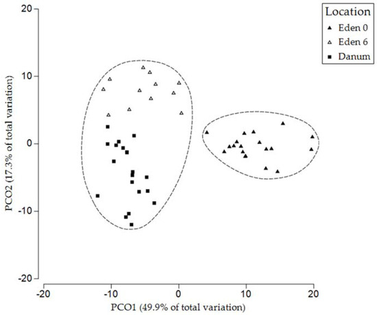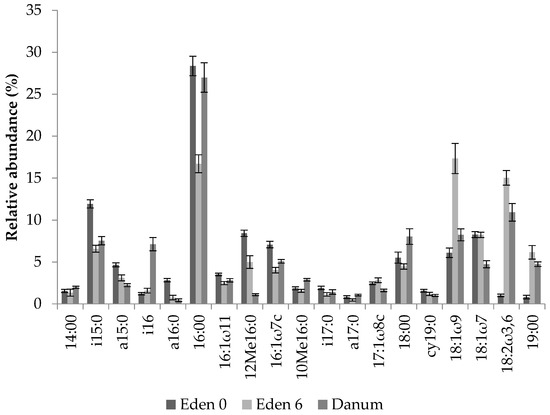 The soils collected from both the Eden Project ferns and those of Danum Valley contained a range of PLFAs of varying abundance. Chromatograms were used to identify the microbial groups present before their relative abundance was calculated (Figure 3). Analysis of PLFAs revealed the presence of Gram-positive and Gram-negative bacteria, actinomycetes and fungi in addition to further peaks, unassigned to specific taxa due to their ambiguous composition [50]. The relative abundance of individual PLFAs varied across collection times at the Eden Project, and also differed from those collected in Danum Valley (Figure 3). However, although the peaks of individual PLFAs differed, analysing entire community profiles revealed a pattern of increasing similarity between the ferns from the Eden Project after 6 months and the ferns from Danum Valley (Figure 4 and Figure 5).