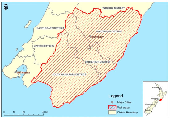The study area is New Zealand’s Wairarapa region (593,803 ha) (Figure 1). The region mainly contains three types of landscape: the western mountains, the central lowlands and the hilly eastern uplands. The climate is warm and dry, with annual rainfall ranging from 800 to 1200 millimetres and maximum temperatures of 20–28 °C in summer and 10–15 °C in winter [30].