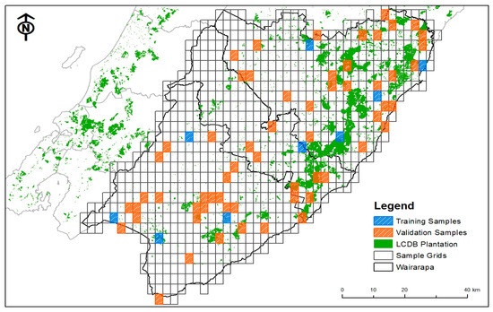 The binomial proportion power calculator developed based on Rosner [38] suggested a minimum of 32 grids be selected as a representative sample of the study area. In total, 69 sample grids were selected to represent the Wairarapa region for plantation derivation. These included nine grids (three randomly selected from each stratified forest area class), which served as the training grids for developing an OBIA forest mapping workflow, and 60 grids (20 randomly selected from each stratified forest area class), which served as the validation grids. The total area of all 69 sample grids was 59,616 ha, which accounted for approximately 10% of the whole Wairarapa area.