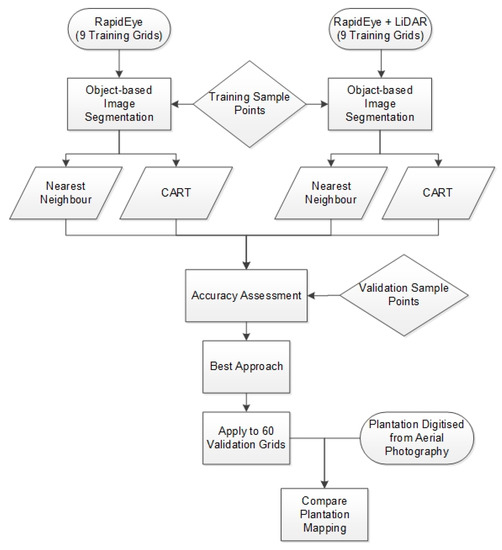 The classification accuracies from different sensor and algorithm combinations across the nine training grids were compared with manually digitised plantation areas to determine the approach with the highest accuracy. This approach was selected and applied to the 60 validation grids. The plantation areas in all 69 grids (9 test grids and 60 validation grids) were mapped using the approach with the highest accuracy and were compared with manual digitisation of plantation area from aerial photography. Figure 3 shows an overview of the plantation mapping process.