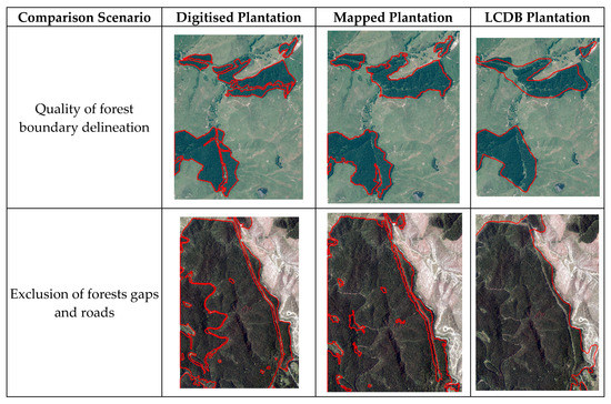 Visual examples of plantation mapped in comparison to digitised plantation and Land Cover Database (LCDB) plantation.