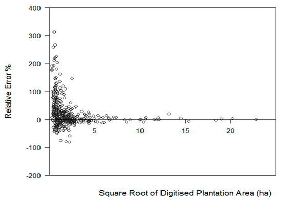 Plot of forest patch size against mapping error, forest patch size is expressed as square root of digitised plantation area, error is expressed as the relative error percentage which was calculated as the difference of mapped and digitised area divided by the digitised area.