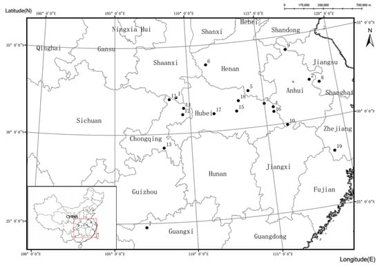Locations of the 19 investigated populations of Q. variabilis. Numbers correspond to the population numbers in Table 1.