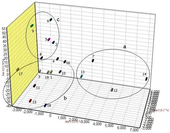 A FCA on genetic structure differences of pattern detection at the population level showed that the populations could be divided into three groups based on geographic location: (a) the Southwest populations: LY, PS, FJ, and WX; (b) the Central populations (the most resource-rich center of Q. variabilis distribution in China): AK, MC, XS, PZ, CK, JS, YS, YA, SZ, and LQ; and (c) the Northeast populations: NJ, CZ, ZM, NX, and XX. The Central populations were adjacent to the Southwest populations and Northeast populations in the FCA clustering groups, whereas the Southwest populations were distantly located from the Northeast populations in the FCA clustering groups (see Figure 2a,c). Small genetic differences between the Central populations and the other two populations were observed, whereas larger genetic differences were detected between the Southwest populations and the Northeast populations.