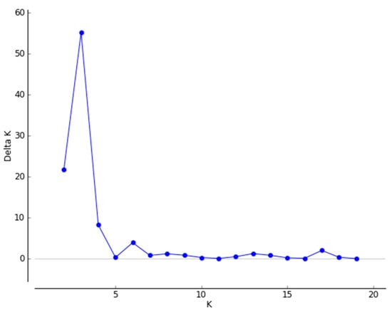 Relationships between the number of clusters (K) and the corresponding ΔK statistics calculated according to ΔK based on STRUCTURE analysis [].