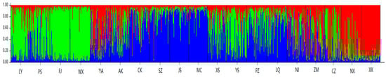 Results of the structure analysis of Q. variabilis populations when K = 3. Each individual is represented by a single vertical bar, which is partitioned into three different colors. Each color represents a genetic cluster and the colored segments shows the individual’s estimated ancestry proportion to each of the genetic clusters. The population codes are as in Table 1.