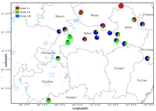 For a more detailed understanding of the genetic structures, using a ΔK value that Evanno proposed to determine a reasonable K, the ΔK value reached a maximum when K = 3 (Figure 3). The 19 geographic populations of Q. variabilis could then be divided into three genetically distinct groups (Figure 4). In addition, we used the relative proportions of the geographical distribution diagram to visually compare the distribution ratio of each group within the population (Figure 5). The 19 populations as a whole were divided into three groups based on geographic distribution (Figure 4 and Figure 5); the first group was the Southwest group (pop1–4), the second group was the Central group (pop5–14), and the third group was the Northeast group (pop15–19). Average distribution ratios [] were 76%, 72% and 73%, respectively. The Central group had the lowest distribution ratio, i.e., the highest mixing degree among groups. XX (Northeast group, ratio: 87.9%), JS (Central group, ratio: 83.4%), and WX (Southwest group, ratio: 88.9%) were the source populations in each group, which had the highest distribution ratio.