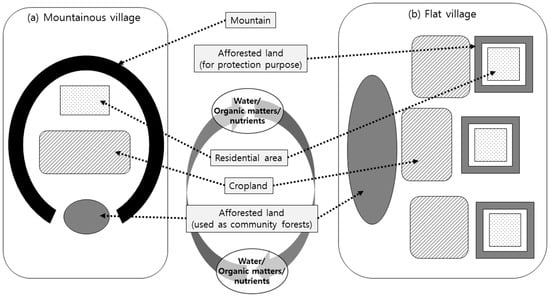 Fengshui-based forestry in ancient Northeast Asia was adjusted to local experience and knowledge on topography, climate, and tree species. Ancient villagers living on riversides changed the basic afforestation strategy to prevent flooding and soil erosion by planting water-tolerant tree species between the village and river []. In coastal areas, they altered the strategy to establish windbreak forests, consisting of salt-tolerant species such as Pinus thunbergii Parl., alongside the sea coast []. It was also applied to more practical forest management purposes than the original land planning and management concepts. One significant example of the practical Fengshui application was the community forest (afforested lands near villages shared for various purposes by the villagers). Community forests, such as Fengshui forests in China, Satoyama (village mountains) in Japan, and Maeulsoop (village groves) in Korea, were widespread in ancient Northeast Asia because of the common cultural afforestation practiced on the basis of Fengshui []. These forests allowed water, organic matter, and nutrients to circulate between the forests, croplands, and village, as they connected these natural and anthropogenic components according to Fengshui [,] (Figure 1). Therefore, community forests in Northeast Asia were important for the livelihoods of ancient society, such as the supply of timber, fuel, fodder, and compost for agriculture and residence [,].