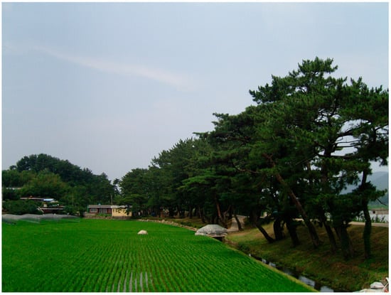 - Park, J.-C. Concept and case of village grove. Keimyung Korean Stud. J. 2006, 33, 233–262. (In Korean) [Google Scholar]