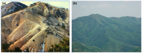 (a) Deforested lands in the mid-twentieth century (Photo from the Korea Forest Service) and (b) revegetated forests after the national forest restoration programs in South Korea.