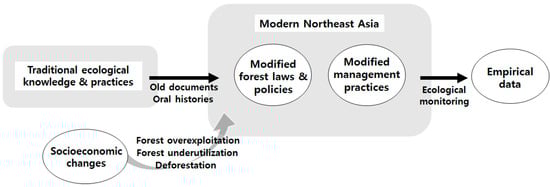 Applying traditional ecological knowledge and practices to current forest management practices still remains challenging despite its benefits. Less intensive forestry systems based on the traditional concept might not be enough to substitute the modern forestry system, which has satisfied the demands for industrial and commercial forest products []. The traditional concept is limited to the pilot level due to the lack of scientific understanding on the link between traditional ecological knowledge and the socioecological system resilience []. These issues should be thoroughly considered before applications of the traditional concept at broader scales. However, the previous trends in China, Japan, and South Korea reflect the importance of traditional ecological knowledge and practices—incorporated into modern forestry systems—in the face of socioeconomic changes to date.