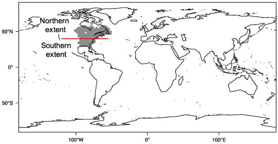 Global simulations were run with where the vegetation in eastern North America (gray region) was modified to represent 100% coverage by each of the plant types in Table 1. We focused our analysis on the modified grid-cells and further divided the analysis into the northern extent (gray area above 40° N) and the southern extent (gray area below 40° N).