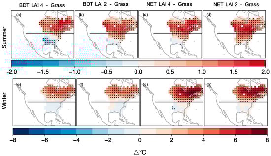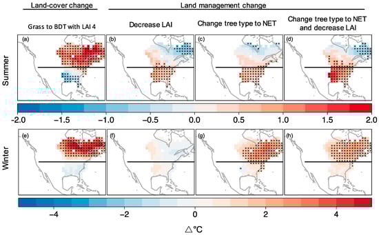 An analysis of the simulations in Figure 3 to compare the influence of land-cover change (a,e: defined as afforestation from grass to broadleaf deciduous tree with an LAI of 4) to the influence of land management (b–d,f–h: defined as change in tree type or a decrease in LAI from 4 to 2) on seasonal land surface temperatures. The stipples denote statistical significance between simulations at the p < 0.05 level. The horizontal line denotes the northern and southern extents used in the analysis.