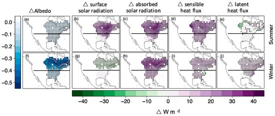 The influence of afforestation in eastern North American on albedo (a,f), solar radiation passing through the atmosphere to reach the land surface (b,g), solar radiation absorbed by the land surface (c,h), sensible heat exchanged between the land surface and the atmosphere (d,i), and latent heat exchange between the land surface and the atmosphere (e,j). Summer and winter months are shown for afforestation using a broadleaf deciduous tree type with an LAI of 4. The stipples denote statistical significance between simulations at the p < 0.05 level. The horizontal line denotes the northern and southern extents used in the analysis. Albedo is the ratio of outgoing to incoming solar radiation. Solar radiation, sensible heat flux, and latent heat flux are expressed as the change in energy flux, defined as a watt m−2 (equivalent to a Joule m−2 s−1).