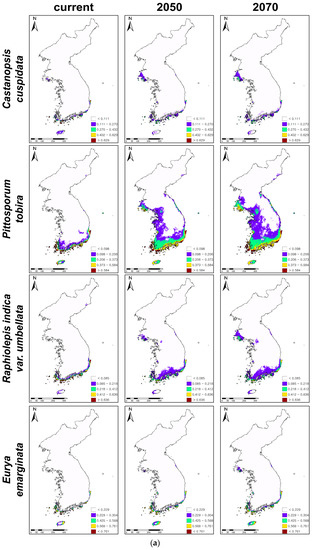 The predictions suggested that the climatically suitable habitats of C. cuspidata, P. tobira, R. indica var. umbellata, and E. emarginata would generally expand to the north along with the west coastal areas (Figure 2a,b). In particular, P. tobira and R. indica var. umbellata would expand from the coastal to the inland areas and from the south to the north along with the east coastal areas, as well as the west coast. On the other hand, even though C. cuspidata, R. indica var. umbellate, and E. emarginata showed potential expansions of suitable habitats under climate change, the highly suitable habitats (red-colored areas on the maps, Figure 2a) of three evergreens all declined, so there are no red colored habitats in the southwestern islands and coastal areas.