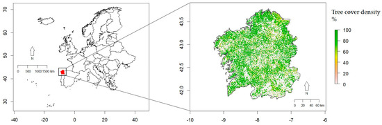Eucalyptus spp. plantations (mainly Eucalyptus globulus Labill.) in Galicia (see the geographical location in Figure 1) are some of the most productive and profitable timber production systems in Europe. The first plantation with this species in Spain dates from around 1850 [50]. Nowadays, more than 0.6 million ha of land are covered with Eucalyptus spp. in Spain, and the volume of Eucalyptus globulus harvested annually is about 6 million m3 [51]. Although, in the best sites, timber yield may reach up to 50 m3 per ha and year, these plantations in Galicia are usually very fragmented and industrial plantations are scarce [52]. The stands are managed on the simple coppice system, without any environmental constraints. In short, even-aged stands developed from planted seedlings are clear cut at the end of the first rotation, and repeated crops (frequently two or three) secured from stump-sprouts are coppiced on succeeding rotations [53]. This species in Spain is commonly managed in rotations of 12–18 years.