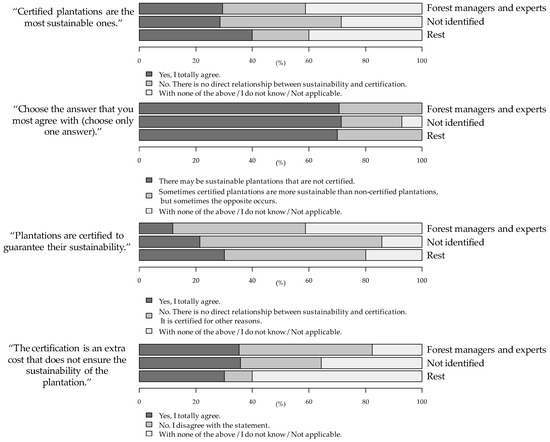 Moreover, the relationship between the answer to the statement “Certified plantations are the most sustainable ones” and “Plantations are certified to guarantee their sustainability” was found to be statistically significant since the null hypothesis of the Pearson’s chi-squared test was rejected (Cramér’s V = 0.419). Similarly, there was also a significant relationship between the answer to the statement “Plantations are certified to guarantee their sustainability” and the statements where respondents had to choose between “There may be sustainable plantations that are not certified” and “Sometimes certified plantations are more sustainable than non-certified plantations” (Cramér’s V = 0.423). These results were on par with the first hypothesis that assumed a direct relationship between certified forestry systems and sustainability since most stakeholders agreeing with one statement agreed with the other one, and vice versa. On the other hand, there was a significant relationship between “Certified plantations are the most sustainable ones” and “The certification is an extra cost that does not ensure the sustainability of the plantation” (Cramér’s V = 0.468). In this case, the relationship turned out to be significant due to most stakeholders agreeing with one statement and disagreeing with the other one, and vice versa. For this reason, this result was also in line with the first hypothesis. There was no significant relationship between “Plantations are certified to guarantee their sustainability” and “The certification is an extra cost that does not ensure the sustainability of the plantation”. This suggested a very weak association between these two statements.