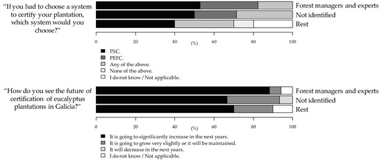 It is of interest to highlight that the certification standard preferred by the stakeholders was the FSC one, when the surface certified in Galicia is significantly smaller than that with PEFC, although some industrial plantations have been certified by both systems [34]. Although the stakeholders surveyed were not asked the reason for their preference for one certification system or another, the results obtained are in accordance with some studies that, based on a meta-analysis, report that forests certified with FSC reach a more sustainable forest management than with PEFC [36]. Other studies also show how, in forest industry companies, those employing FSC are superior to those using PEFC [8]. However, as some other authors have confirmed (e.g., [40]), the number of hectares certified by one system compared to another cannot be interpreted as being an indicator of the sustainability of the management in the forest systems analyzed.