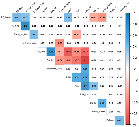 Principal Component 1(PC1): Socio-economic conditions and Ownership. The most influential variables are the economic ones related to the public forest sector: ownership of forests (private and public are the reciprocal of one another), GDP per capita, Annual Working Unit (AWU) in forestry, removals from State, and Agricultural Value Added on total GDP (see Table 2).
