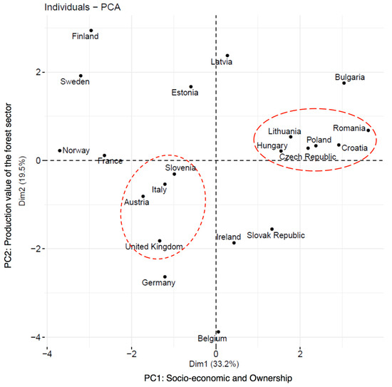 In this study, we obtained three principal components (PC) (see Table 2) that distinguished different groups of European countries, which we can observe on the four quadrants of the PCA graphs (see Figure 2 and Figure 3) in terms of similarities in the forest sector at a national level with respect to the selected indicators.