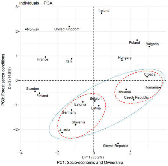 The variables contributing most to PC3 are not well correlated. Nevertheless, we can distinguish one large group for this component that is spread along the vertical axis with values from 0.1 to −2.2 (see Figure 3, blue ellipse). The forest sectors of these countries have a high value for growing stock and high % of forest within protected areas; indeed, these variables have a moderate positive relationship (R = 0.48). If we also consider PC1, this group can be split into two for the variable of forest ownership (see Figure 3, red ellipses) (group 1: Romania, Lithuania, Croatia, and the Czech Republic; group 2: Belgium, Estonia, Latvia, Germany, Slovenia, and Austria).