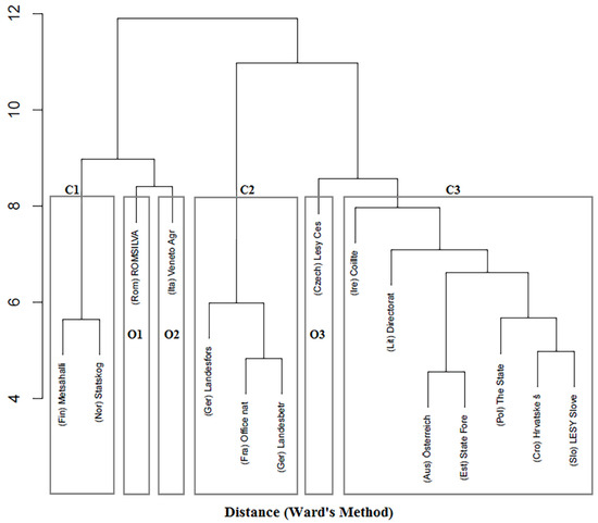 Profit-oriented SFMOs—Cluster 3 (LESY Slovenskej republiky (Slovakia); Croatian Forests (Hrvatske šume) Ltd. (Croatia); The State Forests National Forest Holding (Poland); State Forest Management Centre (RMK) (Estonia); Austrian Federal Forests (ÖBF) (Austria); Directorate General of State Forests (DGST) (Lithuania); Coillte (Ireland). LESY Slovenskej republiky (Slovakia) and Hrvatske šume Ltd. (Croatia)). These SFMOs have adopted a commercial model of forest management, and therefore, the economic pillar of SFM prevails. It is interesting to note that this model is used in both forest rich (e.g., Austria and Poland) and low forested countries (e.g., Ireland). Thus, it seems that the predominance of economic goals is not necessarily connected with the importance of the forests in the national economy, as one might have expected. It is interesting to note that Irish Coillte is the commercialized state organization that manages to retain a dominant share of the market, where private forest owners do not feature significantly in the timber economy [17]. However, Coillte has the biggest institutional challenge over the next 10 years as private owners begin to compete as their forests reach maturity and they become competitors in the Irish market [17]. Together with Coillte, other SFMOs apart from Austrian ÖBF manage a significant part of the forest area in their countries. It is therefore important to remember that when commercialized state organizations operate in economies where the share of private forest ownership is low or is expected to increase over time, they can pose a threat to private producers because of their dominant position in the market, which they are unlikely to yield [17]. The C3 also contains SFMOs with different organizational structures, such as joint stock companies owned by the State in Ireland and Austria and a state enterprise as a government department in Poland [9]. The State Forests (Poland) is a hierarchical organization with policy-making and forest management being integrated within one entity. Brukas (2010) characterized this SFMO with a command style administration, while ÖBF and Coillte have functions of profit-oriented managers. The cluster analysis results for SFMOs do not seem to be very similar with groups that we can distinguish with the help of PCA for countries. C3 is relatively large and consists of SFMOs from countries with very different profiles. The differences are in geographical location, natural conditions, economic, and social development. We can therefore assume that the direction and management goals of SFMOs do not depend solely on the country characteristics or geographical region, but on their own priorities.