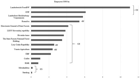 Cluster 2 (C2) is composed of three SFMOs: Landesbetrieb ForstBW (Germany); Office National Des Forêts (ONF) (France); Landesforst Mecklenburg-Vorpommern (Germany). All SFMOs have a very high amount of production forest (in Germany more than 90%). At the same time, three of them have the lowest numbers by indicator “profit/assets” (ONF—(0.07), Landesbetrieb ForstBW—(−0.39), Landesforst Mecklenburg-Vorpommern—(0.34), in average in the sample—(2.89). In addition, the indicator of labor productivity (employees/1000 ha) in C2 is very different from other SFMOs (see Figure 5). The number of employees per 1000 ha in these SFMOs is much higher than in others (e.g., in ONF it is six employees per 1000 ha, in Landesbetrieb ForstBW—11 employees per 1000 ha when an average in the sample—3.5 employees per 1000 ha).