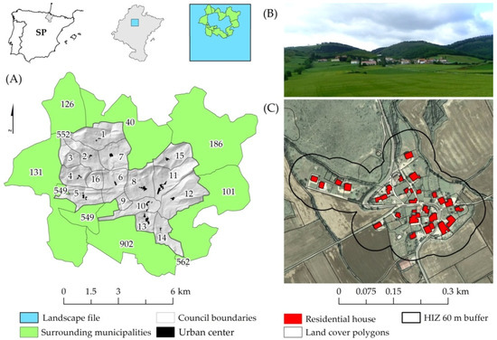 Location of the Juslapeña Valley (3163 ha) in central Navarra (Spain) (A). The numbers refer to the regional cadaster council polygon (1 to 16) and municipality code (B). The 36,000-ha wildfire modeling domain framed by the landscape file (LCP) encompassing the study area had a wider extension to the south to account for incoming fires from the fire-prone areas of central Navarra. Land covers in the cultural landscapes present sharp edges in vegetation (B urban center of the council No. 8). Detailed cartography and cadaster polygons (scale 1/5000) were used to generate surface fuel maps (sigpac.navarra.es) and locate residential houses (catastro.navarra.es) (C). The HIZ is the 60-m buffer around structures [11], and was calculated for each residential house to conduct this study. In the figure (C) we show the external HIZ contour of the residential houses in urban center of the council No. 8.