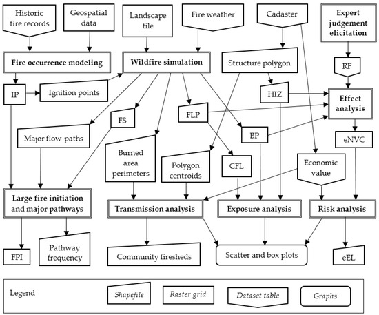Wildfire simulation outputs were used to assess large fire initiation, transmission, exposure and risk to residential houses of rural communities within the study area (Figure 2). We combined five sets of fire simulation outputs (BP, FLP, FS, burned area perimeters and major flow paths), one for each scenario by weighting the relative scenario probability (Table 2).