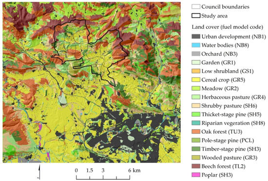 Land cover map (idena.navarra.es) and assigned fuel models [44,45] for the wildfire modeling. The large urban development areas in the southeast correspond to the capital city of Pamplona. Cereal crops occupy all the flat cultivated areas to the south and mountains in the northern part are covered by mosaics of different forest types. See fuel model parameter details in the references [44,45].
