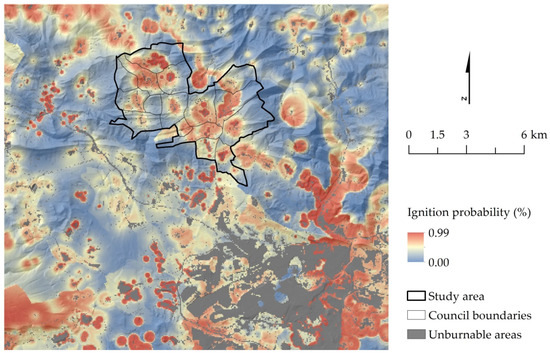where the FS is the spatially smoothed fire size grid, and IP is the historical-based ignition probability grid generated with the ANN fire occurrence model (Figure 4) used to generate the fire ignition input file. We used a kriging geostatistical analysis method to generate a continuous distribution grid of FS from fire size data contained in the ignition location output point file. MTT flow-paths within surrounding municipality polygons (Figure 1A) were then overlaid and classified in three frequency classes (<33%, 33%–66% and >66%), considering the simulation scenario probability (Table 2), to identify preferential pathways entering to the Juslapeña Valley.