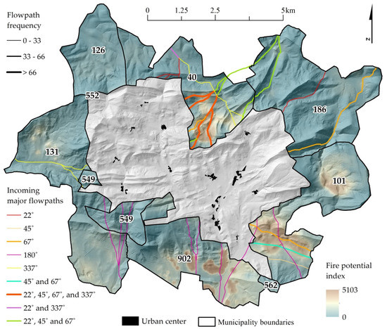 Fire potential index (FPI) and incoming major flow-paths from the surrounding municipalities. FPI was calculated by combining the fire size and ignition probability output grids, and was used to identify the areas where the ignition of a large fire is more likely [31]. Major flow-paths were obtained with the minimum travel time algorithm (MTT) [62] considering the five most recurrent fire weather scenarios (Table 2). The flow-path thickness indicates frequency and color indicates fire scenarios.
