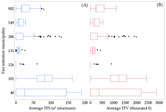Box plots of average wildfire transmission into the study area from independent ignitions in surrounding municipalities (Figure 1A), in terms of (A) number of residential houses and (B) cadaster economic value of residential houses affected. For every fire ignition, the number of affected structures and the sum of their economic value was calculated combining the results obtained in the five modeling scenarios (Table 2). Boxes indicate the first/third quartiles, the whiskers indicate 10th/90th percentiles, the black line within the box is the median, and the dots indicate values below the 10th percentile or above the 90th percentile. The municipalities are identified with the cadaster code (Figure 5).