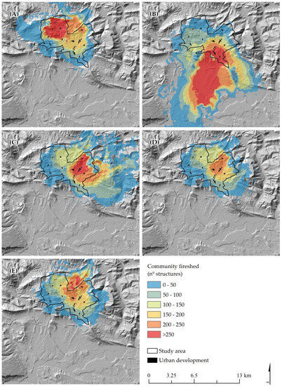 Community fireshed maps corresponding to the number of residential houses burned for the five wildfire scenarios. The letters from A to E indicate respectively the fire modeling wind direction scenarios of 337°, 180°, 67°, 45° and 22° (Table 2). Fireshed values were generated using a 1-km constant width radius spherical semivariogram model kriging analysis from the transmission values (TFS) assigned to fire ignition locations. Values indicate the number of structures affected by ignitions in a given pixel. Fires were simulated for 97th percentile fire weather conditions and 6-hour duration.